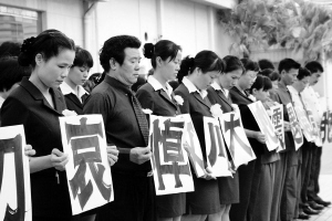 | ↑5月19日14时28分,海口泰华酒店员工向地震中的死难者默哀。