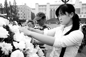 | 5月20日,成都市一名女青年在松枝上别白花,向在汶川大地震中遇难的同胞和亲人志哀。