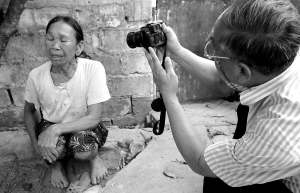 | 专家在对黎族妇女的纹脸进行调查记录。
