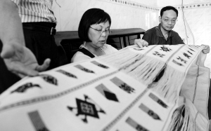 | 姚道中教授(右)及夫人在对织锦作调查记录。 本报记者 张杰 摄 |