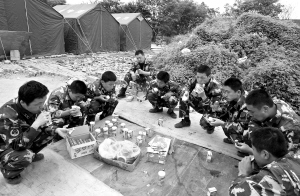 5月20日,驻扎在都江堰市区的海南消防总队的官兵正在用早餐,能这样轻松的吃饭,对他们来说是一件非常幸福的事情。 海南援川救灾特派记者 王凯 摄
