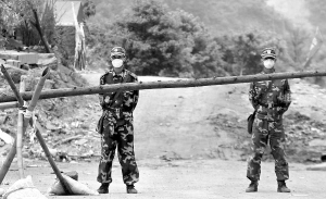 | 图为武警官兵和警察在通往北川县城的道路上设置警戒点,所有人员均不得进入县城。 海南援川救灾特派记者 李英挺 摄 |