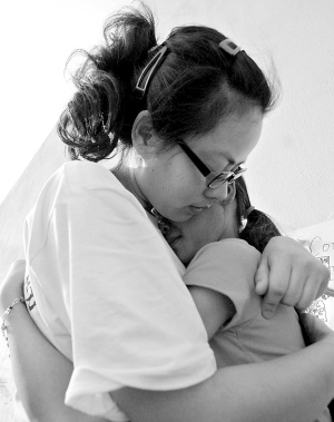 5月19日,在绵阳市九洲体育馆,一名心理辅导者把一位小朋友紧紧搂在怀中。 新华社记者 江毅 摄