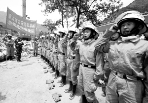 5月19日,黑龙江公安消防总队地震救灾抢险救援队109名消防队员在北川中学救灾现场宣誓自愿加入中国共产党。这109名消防队员经过多个昼夜的连续作战,在生与死面前经受住了考验,用实际行动实践了人民军队全心全意为人民服务的宗旨。 新华社记者 陈树根 摄