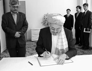 5月20日,在阿富汗首都喀布尔的中国驻阿富汗大使馆,阿富汗副总统哈利利在吊唁簿上留言。当日,阿富汗政府官员、议会议员、驻阿外国使节纷纷前往中国驻阿富汗大使馆吊唁中国四川汶川大地震遇难者。 新华社记者张云龙摄
