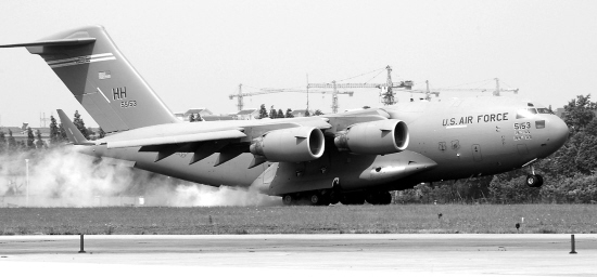 一架载着国际救援物资的美国军用运输机降落在成都双流国际机场。 5月18日,载有法国、美国、俄罗斯、意大利等国家救灾物资的飞机先后抵达成都双流国际机场。 新华社记者 杨世尧 摄