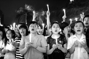 5月20日晚上,省红十字会在海口明珠广场举行募捐活动,数千市民冒着小雨,手捧蜡烛,高呼“中国,加油!汶川,挺住!”广场上的群众齐唱《义勇军进行曲》、《五星红旗迎风飘扬》等歌曲,嘹亮歌声,响彻云霄。 本报记者 苏建强 摄