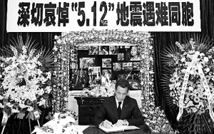 中国政府宣布全国哀悼三天,以悼念这次大地震中的遇难者。全国性哀悼的决定对中国而言尚属首次。一名社会学家说:“1976年唐山大地震的死亡人数比这次要多得多。但当时没有类似这样的哀悼。一个越来越人性化的政府知道这样能给人们带来精神上的安慰,让遇难者知道他们有国家在背后支持。”