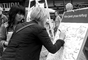 几千人聚集在天安门广场,静静地站在降半旗的国旗杆周围。三分钟过后,他们开始有节奏地呼喊。人群齐声振臂高呼:“中国,加油!中国,加油!” ———法新社(法国)