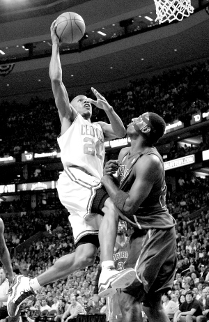 | 凯尔特人队艾伦(左)上篮。 新华社发
