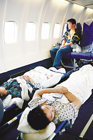 由于此次运送的伤员中大部分是受重伤的担架病人,而每个担架要占据6个座位的位置。为了保证病人在飞行途中能安全、舒适,承运此次伤员的国航特意提前1天将飞机进行改装,把原有的36排座位拆掉了28排,仅留下50个座位。