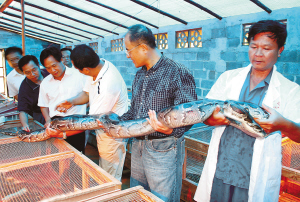 省科技厅对海南东盛弘蟒蛇科技有限公司承担的省级重点科技计划项目———“蟒蛇人工养殖技术及综合利用”进行验收认为,东盛弘成功开发出了人工养殖蟒蛇的饲料配方,取得了突破性成果。公司董事长林明栋告诉记者,养殖蟒蛇以前主要喂食活鸡、老鼠、青蛙等,饲养成本约为150元/条,制约了蟒蛇的规模化养殖。公司开发出了5种全蛋白质的人工饲料配方,解决了人工养殖蟒蛇的饲料难题。该公司仅用1年半时间,蟒蛇养殖地已达到蟒蛇存栏量3万条、种蟒3000条的养殖规模。