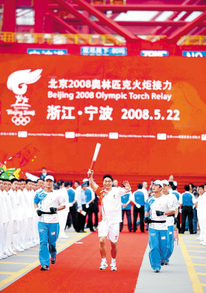 22日7点15分,伴随着汽笛声,第一棒火炬手———宁波市首席工人、北仑港桥吊能手竺士杰手擎火炬从起跑点出发。20名火炬手在北仑港四期码头传递三公里后,奥运火炬从北仑港四期码头转场至宁波市区。