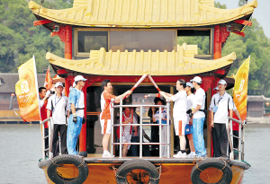| 5月22日,火炬手们在浙江嘉兴南湖船上进行交接。 新华社发 |
