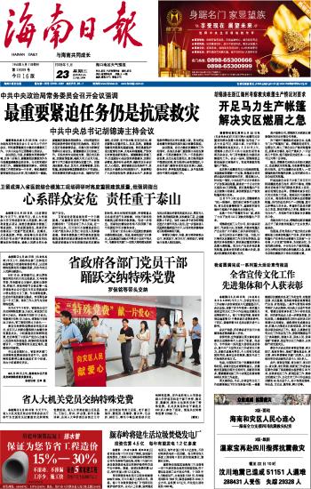 海南日报 头版 001 2008-05-231 2008年05月23日 星期五