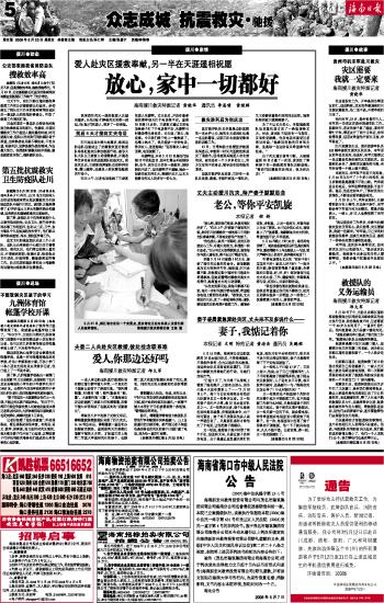海南日报 众志成城 抗震救灾·驰援 005 2008-05-231 2008年05月23日 星期五
