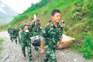 翻山越岭 护送伤员 5月22日,汶川县漩口镇安子坪,海南边防总队抗震救灾野战医院的医护人员和战士翻山越岭将做完手术的伤员伍玉彬护送回家。 据悉,该总队野战医院在汶川漩口镇寿江大桥挂牌成立以来,积极对当地村民和来往患者开展门诊手术。 不少受灾群众动情地说:“感谢你们边防医疗队,是你们救了我,你们辛苦了”。 海南援川救灾特派记者 王凯 通讯员 李强 摄影报道