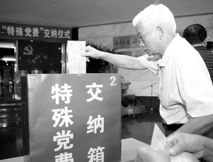 | 上图为白发苍苍的老党员也踊跃交纳特殊党费,向灾区群众献爱心。