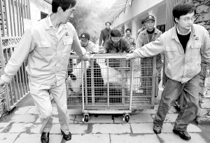 5月23日清晨,卧龙中国保护大熊猫研究中心工作人员将准备转运的大熊猫装笼后,推出圈舍。四川汶川大地震发生后,位于震中附近的卧龙中国保护大熊猫研究中心内,许多大熊猫圈舍损坏,由于竹子来源减少,大熊猫口粮也相对减少。为此,中心将部分大熊猫转移到雅安基地。 新华社记者陈燮摄
