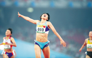 →在23日进行的中国田径公开赛女子400米栏决赛中,中国选手黄潇潇先是被判犯规取消成绩,经过申诉后,她的金牌失而复得。图为黄潇潇冲刺瞬间。 新华社发