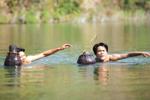 | 五指山市毛道乡的两位黎族青年,利用渡水葫芦过河去寻找野蜂蜜。