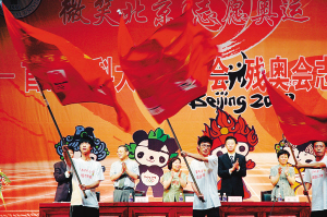 | 5月26日,承担北京奥运会、残奥会医疗救护志愿服务的首都医科大学千余名教职工和学生举行誓师大会。图为志愿者在誓师大会上挥舞队旗。 新华社发 |