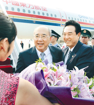 受中共中央和胡锦涛总书记委托,中共中央台湾工作办公室主任陈云林前往机场欢迎吴伯雄一行。陈云林在致辞中表示,吴伯雄主席和访问团一行带着台湾2300万同胞求和平、求安定、求发展,希望两岸互惠双赢、共创未来的良好愿望前来,我们深信这次访问必将在新形势下促进国共两党进一步交流、沟通与合作,续写新的华章,为两岸关系和平发展作出重要贡献。