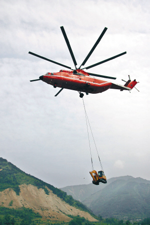 ← 5月26日,米-26直升机在向唐家山堰塞湖坝顶吊运挖掘机。 新华社记者李刚摄 |