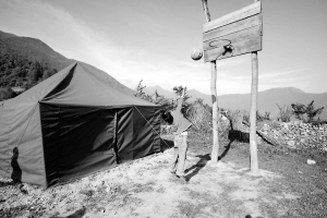 ↑ 5月24日,在四川宝兴县硗碛藏族乡嘎日村,9岁的二年级学生张曼在简易篮球架前玩篮球。旁边是搭建不久的帐篷教室。 海南援川特派记者 王凯 摄