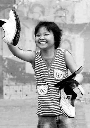 → 5月26日,在四川绵竹市汉旺镇的受灾群众安置点,一位小女孩在洗干净鞋子后,高兴地笑了。 海南援川救灾特派记者 王凯 摄