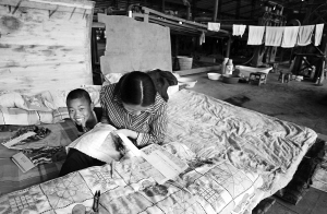 ↑ 5月21日,在都江堰幸福镇联盟村的一个受灾群众安置点,一位母亲正在绣十字绣。她说,等到新家建好了就挂在墙上。 海南援川救灾特派记者 王凯 摄