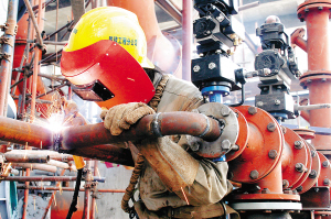 | 华能海口电厂节能减排不含糊。图为一名电焊工人焊接石膏排泵管道作业。