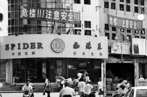 | 琼海市中心一幢楼房上最近挂出“危楼,注意安全”的醒目横幅。据附近市民介绍,这幢楼房已很陈旧,两条横幅大约已挂了一个月,原以为旧楼要拆了,谁知楼里几家商店仍在照常营业。一位营业员告诉记者横幅是业主公司挂的,无人通知她们停业。 特约记者 蒙钟德 摄 |