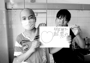 “汶川大地震里与我同年龄的小朋友教会我要学会坚强,我不想也不会放弃生命。”为了证明这一点,躺在病床的桂春迎突然坐起来,用一支红笔在一张白纸上画了一颗大大的红心,表明他对灾区小朋友的关心和挂念;在大红心的右下方,他写了“与灾区的孩子一起努力”这样一句话。(见上图,本报记者 苏建强 摄)