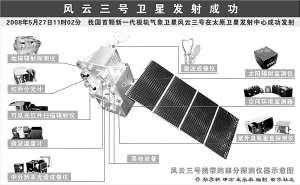 据新华社电 2008年5月27日11时02分,我国首颗新一代极轨气象卫星风云三号在太原卫星发射中心发射升空(见上图)。这颗装载10余种先进探测仪器的卫星升空后,将使中国气象观测能力得到质的飞跃。风云三号卫星在分辨率、探测灵敏度、定标精度三个性能指标方面,紧跟国际同类卫星先进水平。通过全球、全天候、三维、定量、多光谱遥感,风云三号A星将与静止气象卫星风云二号C星、D星一起,为北京奥运会提供更精准的气象服务。