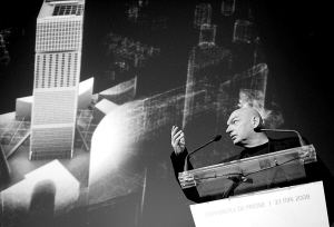 | 5月27日,在法国首都巴黎,著名建筑师让·努韦尔发表讲话,介绍名为“信号塔”的大楼。 新华社/法新 |