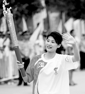 | ↑ 5月28日,北京奥运会圣火在安徽合肥传递。图为奥运火炬手李娜手持火炬传递。 新华社发 |