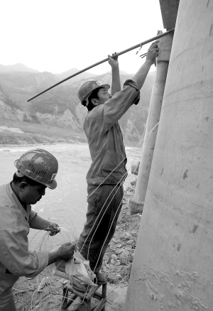| ← 5月28日,汶川县映秀镇工人们正在给百花大桥填放炸药,这座在地震中损毁的大桥将被炸毁。