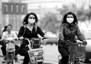 | 5月28日,呼和浩特市民在大风沙尘中骑车行进。