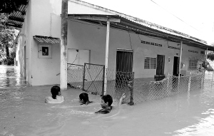 5月28日,在哥伦比亚萨尔加港,几个孩子在被水淹的房子附近游泳。哥伦比亚政府当天说,哥大部分地区近几周来持续降雨,自24日以来已造成9人死亡,32人受伤,另有逾10万人受灾。 新华社/法新