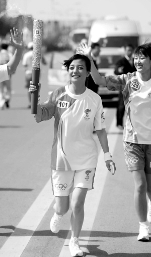 | 5月29日,奥运火炬手赵薇手持火炬传递。 新华社发