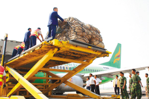 (上接第一版)与此同时,一架货机从青岛调至天津,将国家商务部组织的5.16吨油桶顺利运到双流机场。另一架货机此时在杭州满载国家商务部的14吨救灾器械飞抵成都,马上又从成都飞往上海,于中午前将慈济慈善事业基金会捐助的约5吨重的药品送到四川。海口—成都航班也从凌晨至中午连续飞行两班,分批将海南省政府组织的棉被、药品等物资运往四川。