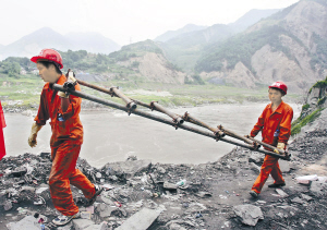 | 5月28日,在汶川县映秀镇,工人们在路上清障,这里的道路随时都会因山体滑坡堵塞。