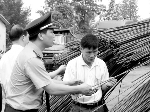 今天上午,省工商局市场规范管理处、海口工商局龙华分局执法人员,来到海口海盛路立有学校后面一块空地进行检查,发现该空地上一辆“渝”字车牌的大卡车上装有不少钢材,离大卡车不远处,堆放着大量尺寸大小不一的钢材。经专家初步检查发现,该空地这批钢材中,直径为10毫米和12毫米的两种规格螺纹钢,与正规厂家生产的螺纹纲相比较,尺寸明显偏小,涉嫌不合格产品。