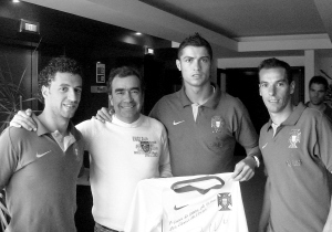 为帮助中国四川地震灾区,葡萄牙球星罗纳尔多近日在一件葡萄牙国家队球衣上签名,并将签名球衣交与葡萄牙四川地震援助会,拍卖所得款项捐给地震灾区。 新华社发