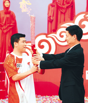 | 6月2日,北京奥运圣火在湖北荆州传递。图为第一棒火炬手郑李辉(左)从荆州市委书记应代明手中接过点燃的火炬。 新华社发 |