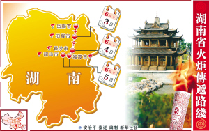 湖南火炬接力将在岳阳、汨罗、长沙、湘潭和韶山5地进行。3日首先在岳阳和汨罗开始:在闻名天下的岳阳楼前揭幕,在沿湖风光带、洞庭大道传递后,转战至汨罗与当地进行的龙舟赛交相呼应,总路程共21.3公里。