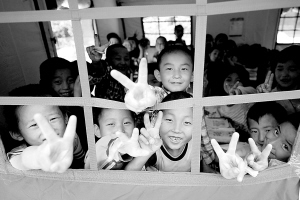 6月2日,在甘肃省陇南市武都区地震灾区,石门乡小山坪小学的学生在课间休息时从帐篷教室里向外张望并打出胜利的手势。至6月2日18时,陇南市已有1911所学校完全复课,229所学校部分年级复课,复课学校占全部学校的74%,34.4万名学生重新走入课堂。新华社发