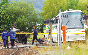 7死25伤 6月2日,在法国上萨瓦省城镇莫桑日一处交叉路口,警察在一辆被撞坏的校车旁勘察。当天下午,这里发生一起火车与校车相撞事故,已造成7名学生死亡,另有25人受伤。 新华社/路透
