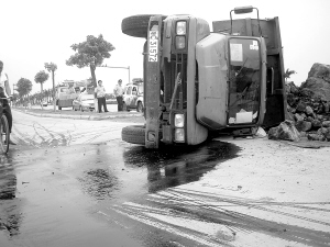 记者赶到事故现场时,交巡警已在现场调查处理。车主薛先生介绍,他的车载重量是5吨,实际拉了15吨的大石头往新埠岛。当时该卡车从苍西村由西向东行驶到椰海大道与苍峰路口时,一辆小车由东往西驶过来时突然调头,卡车紧急避让时控制不住就侧翻了。“司机吴某受了一点皮外伤,已被送到医院了。”薛先生说。